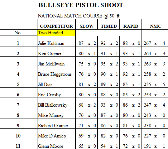 Here are your scores for this Thursday. Congratulations Eric Crosby for one handed shooting with a score of 277 and 5 x’s and Julie Kuhlman for two handed shooting with a score of 267 and 4 x’s!