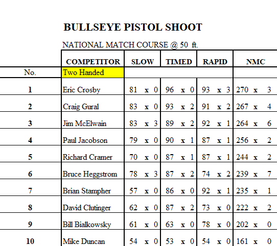 Here are your scores for this Thursday. Congratulations Bill Sickles for one handed shooting with a score of 282 and 6 x’s and Eric Crosby for two handed shooting with a score of 270 and 3 x’s!