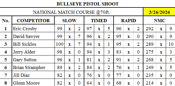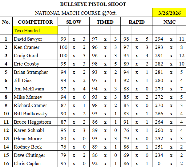 Congratulations Eric Crosby for one handed shooting with a score of 292 and 9x and David Sawyer for two handed shooting with a score of 294 and 11 x’s!