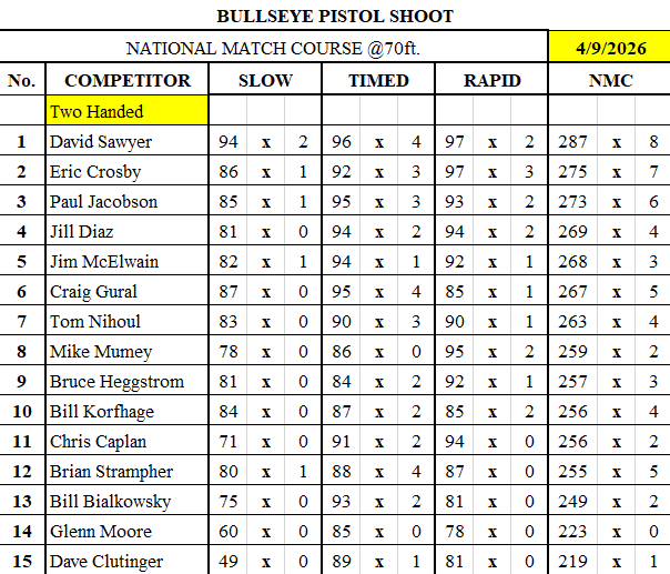 Congratulations Bill Sickles for one handed shooting with a score of 278 and 5x and David Sawyer for two handed shooting with a score of 287 and 8 x’s!